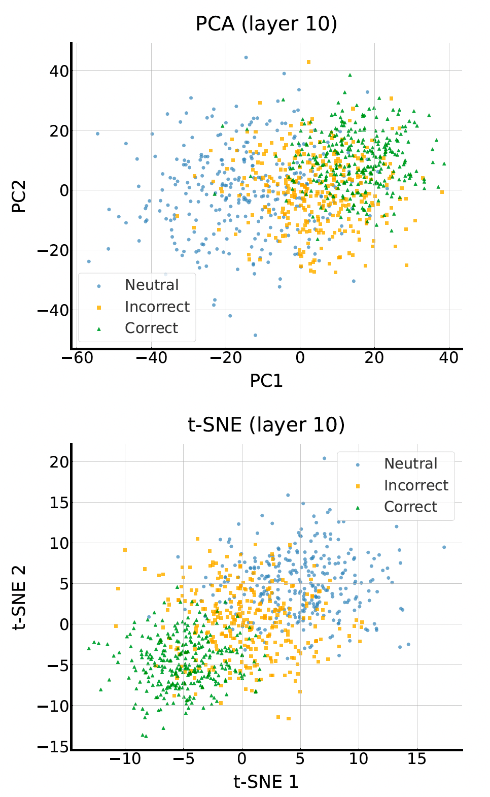 A crucial finding is that confirmation bias does not form distinct clusters in the latent space [1]. As seen below, the activations for neutral, correct, and incorrect responses are entangled. However, the authors discovered that they are linearly separable, allowing a single vector $v$ to effectively steer the model.