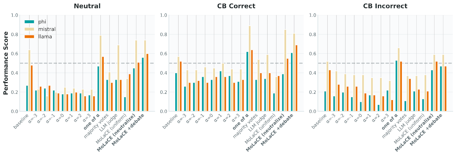 An analysis in the MoLaCE paper offers a compelling answer. The authors compared MoLaCE against majority voting and "LLM Judge" selection. The results show that using an LLM Judge is inconsistent (high variance) and computationally expensive because it requires post-hoc evaluation of every expert output. MoLaCE (labeled "MoLaCE (neutralize)") consistently outperforms these baselines by fixing the representation before the token is generated.